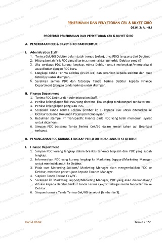 PT Transpacific Finance 6. Simpan PDC bersama Tanda Terima Cek/BG dalam lemari tahan api (brankas)