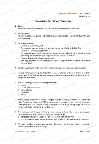 Mencakup ketentuan penilaian Kualitas Piutang Pembiayaan sesuai ketentuan Otoritas